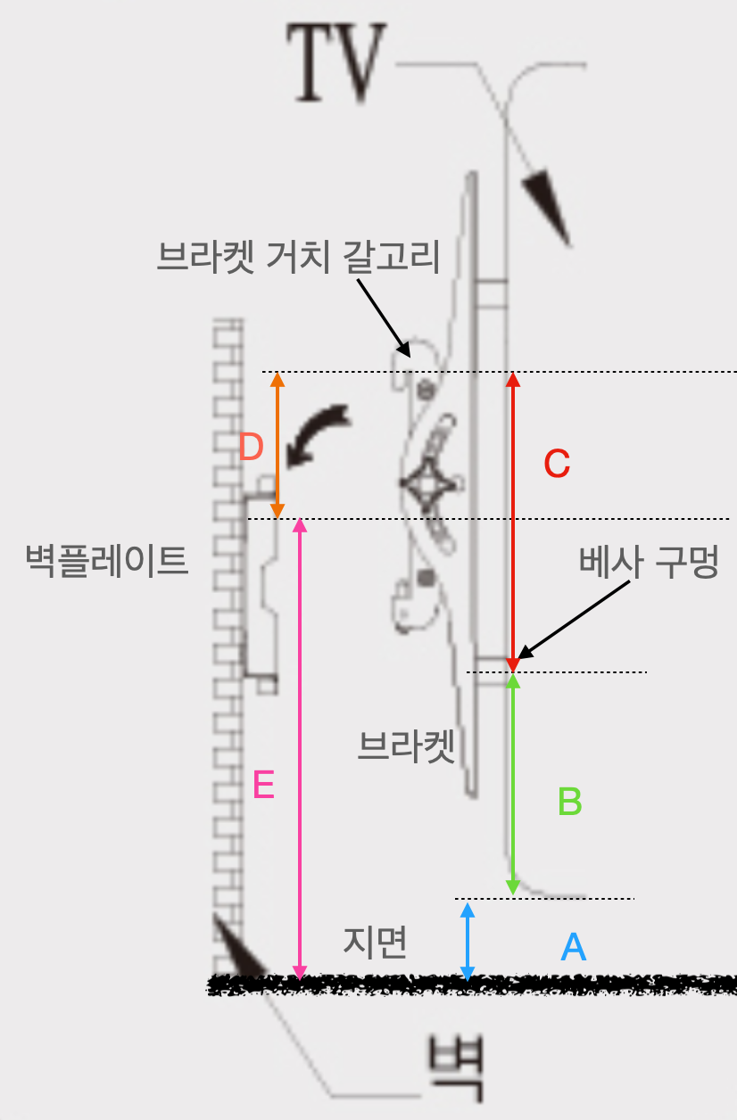 D : [브라켓 거치 갈고리(윗쪽) - 벽플레이트 중심 구멍] : 측정 필요